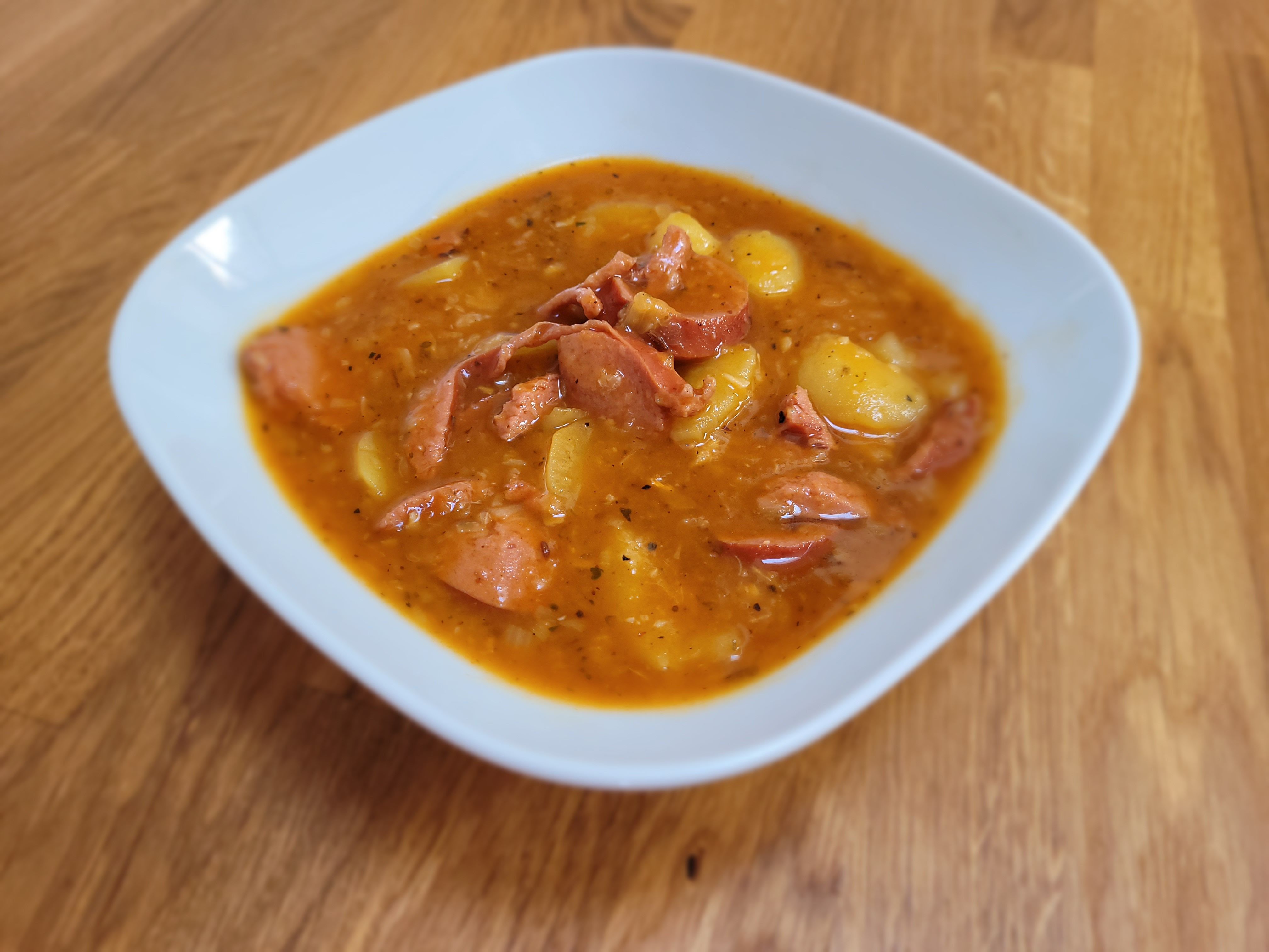 - Do rozpáleného kotlíku dáme rozehřát sádlo, přidáme oloupaný, na nakrájenou uzeninu, cibuli a drcený kmín. Restujeme dozlatova, poté zaprášíme paprikou a krátce orestujeme, zalijeme vodou, přidáme na kostky nakrájené oškrábané brambory (pokud máme rané, dáváme i se slupkou), česnek, osolíme a přivedeme k varu.