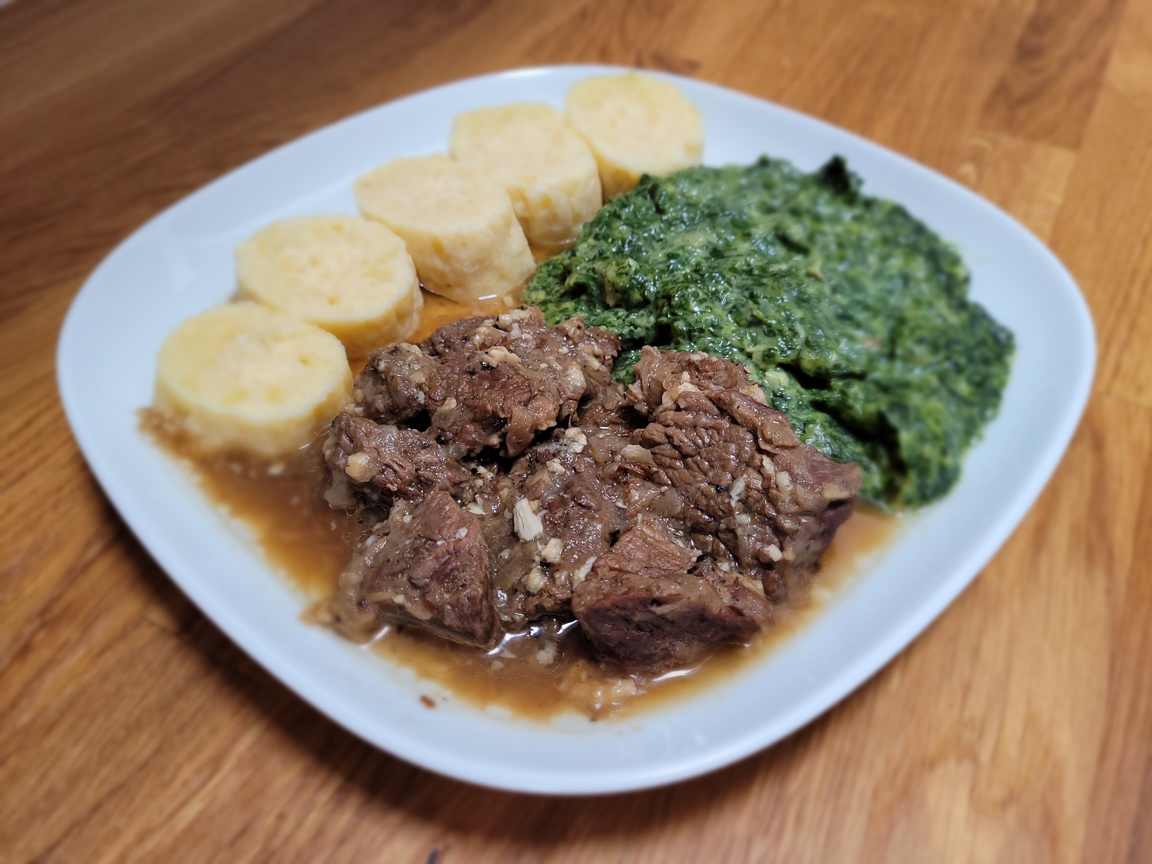 Přidáme na kostky nakrájené maso, promícháme, osolíme a podlijeme vodou. Hrnec přiklopíme a hovězí na česneku dusíme asi hodinu a půl. Pokud je třeba, podlijeme další vodou. Když je maso měkké, prolisujeme k němu zbývající stroužky česneku a ještě krátce povaříme.