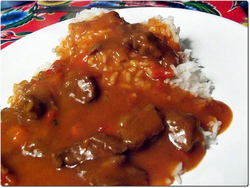 - Přidáme sladkou a pálivou mletou papriku, podlijeme vínem, přidáme nakrájené čili papričky, jalovec a dusíme 90 minut, dokud maso nezměkne.