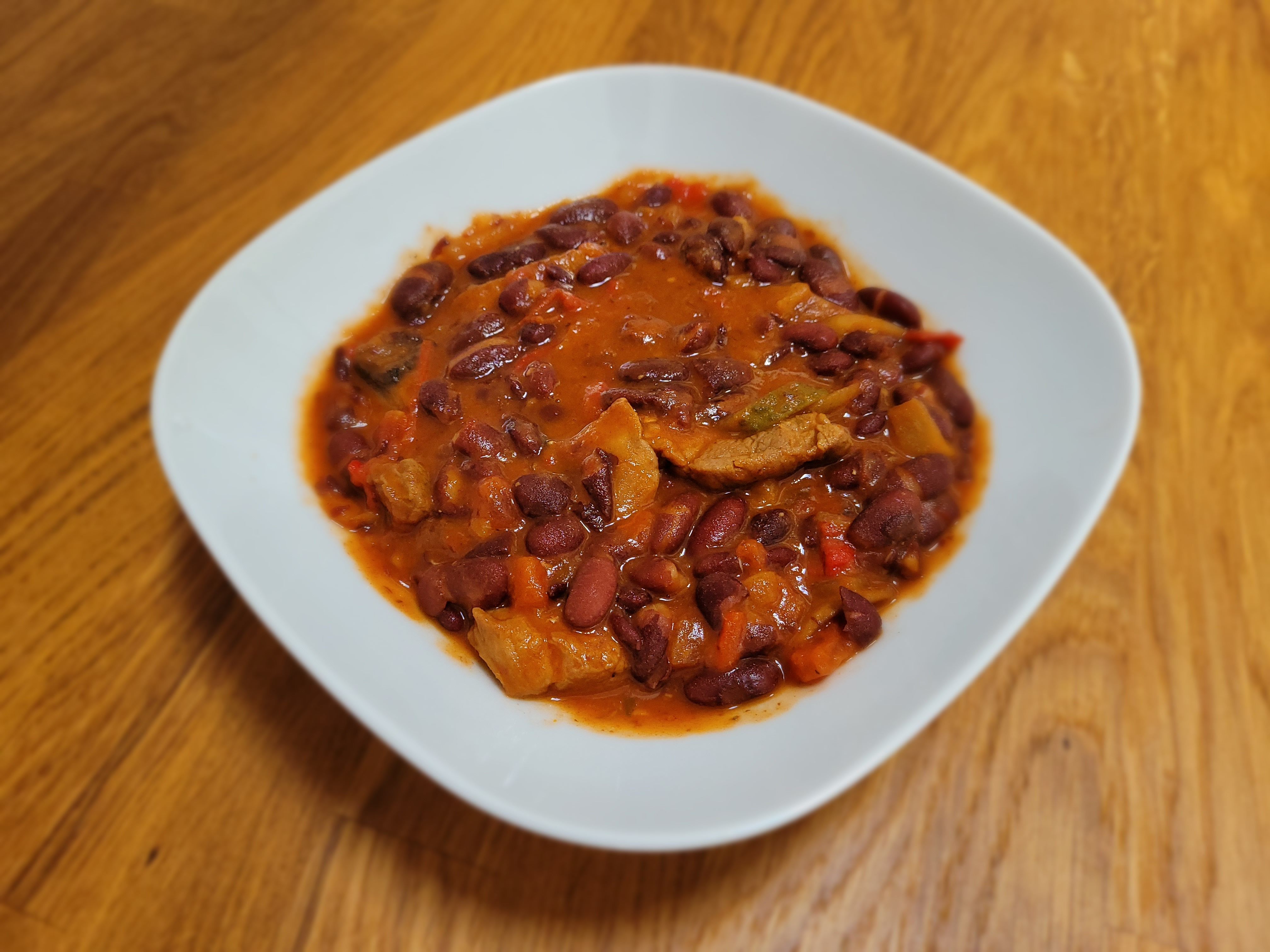 - Přidáme rajčata, fazole, osolíme, opepříme, přidáme cukr a podle chuti dáme pálivou papriku a bazalku, podle potřeby vodu