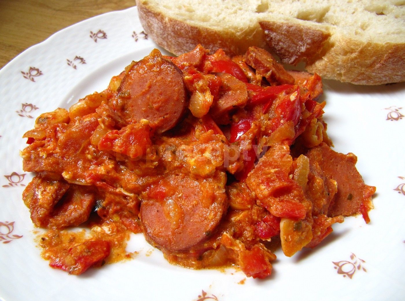- Až se rajčata rozpadnou, tak přidáme klobásu