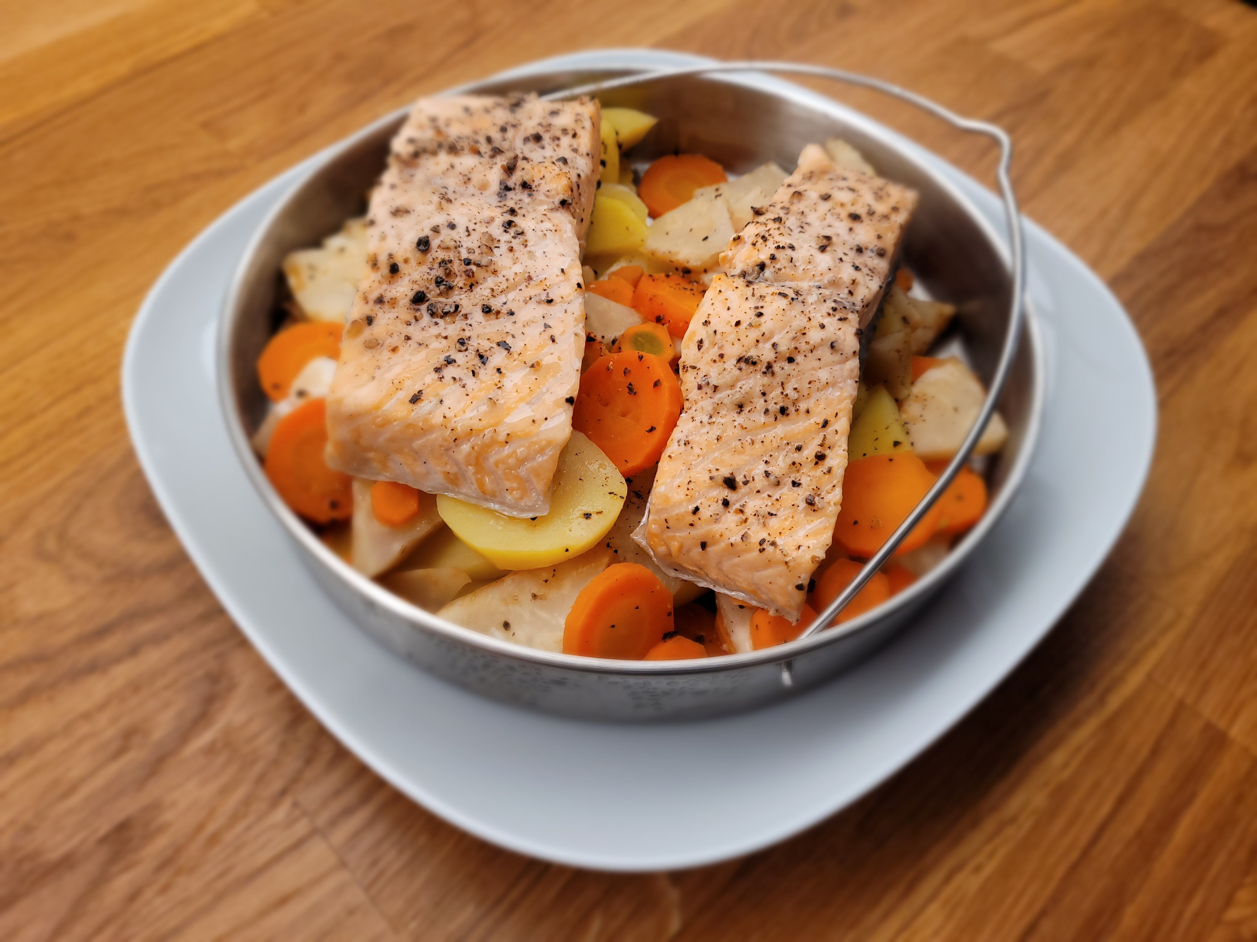 - Na zeleninu položíme lososa, osolíme, opepříme