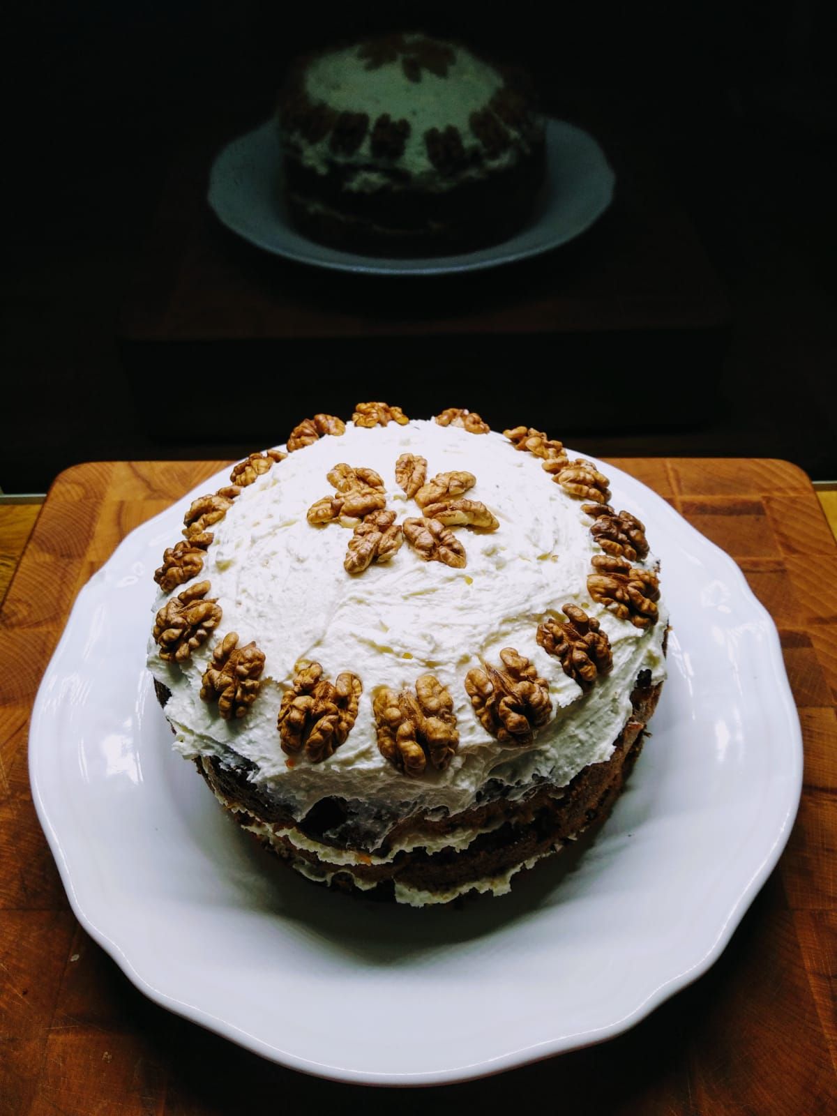 Po vychladnutí korpus rozpůlíme a krém vetřeme dovnitř a na vrch. Můžeme ozdobit ořechy. Případně je dát do korpusu.