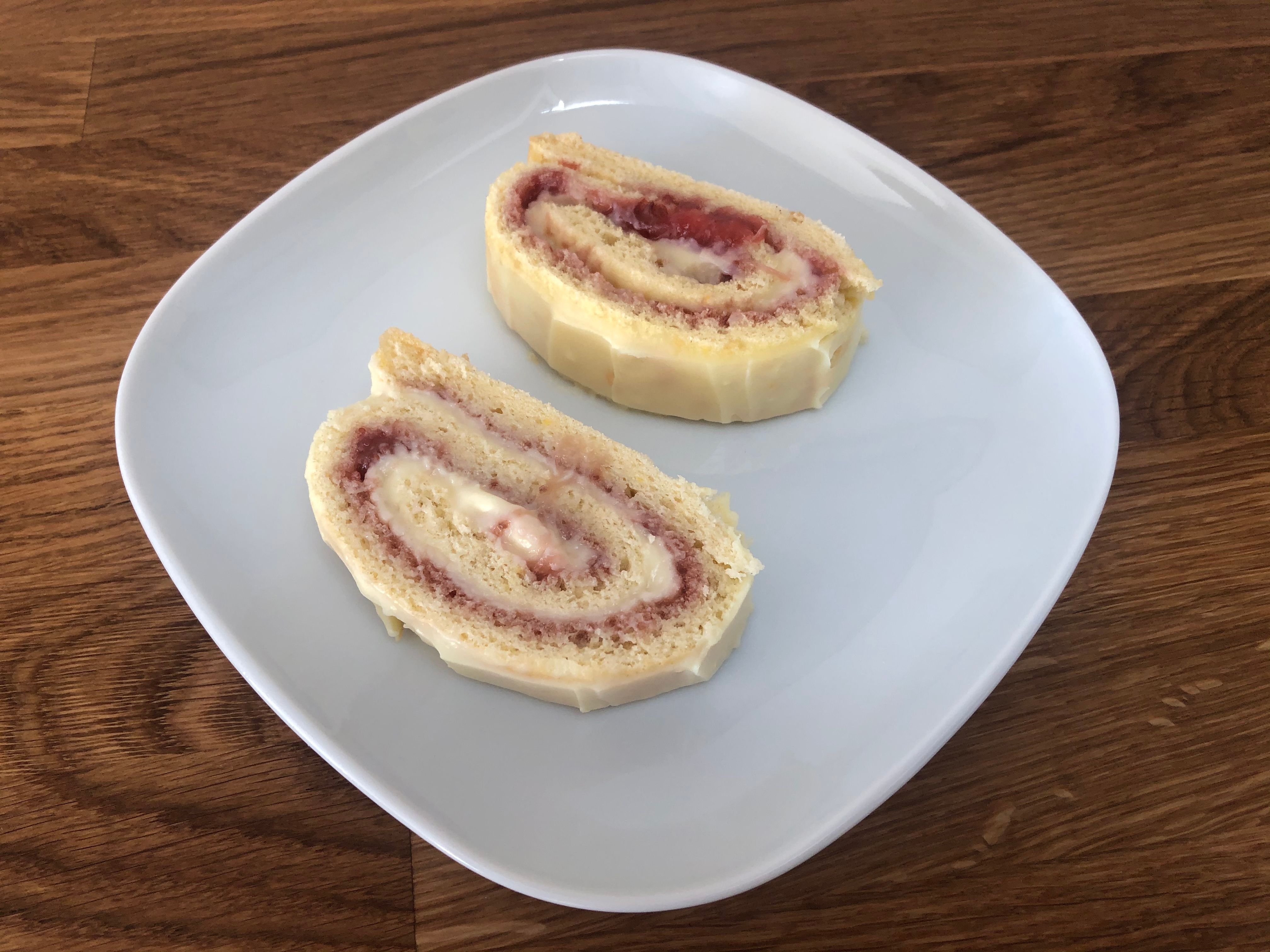 - Piškotový plát přikryjte novým kusem pečicího papíru. Plát se spodním i horním papírem zvedneme z plechu, převrátíme a položíme na pracovní podložku. Dolní strana plátu nyní leží nahoře. Sloupneme papír, na kterém se těsto peklo, a pak ho zase vrátíme zpátky na plát. Nyní všechno společně, tedy piškot i oba papíry, zarolujeme. Rolujeme ve směru kratší strany, aby roláda byla dlouhá a tenká, nikoli krátká a silná. Necháme vychladnout.