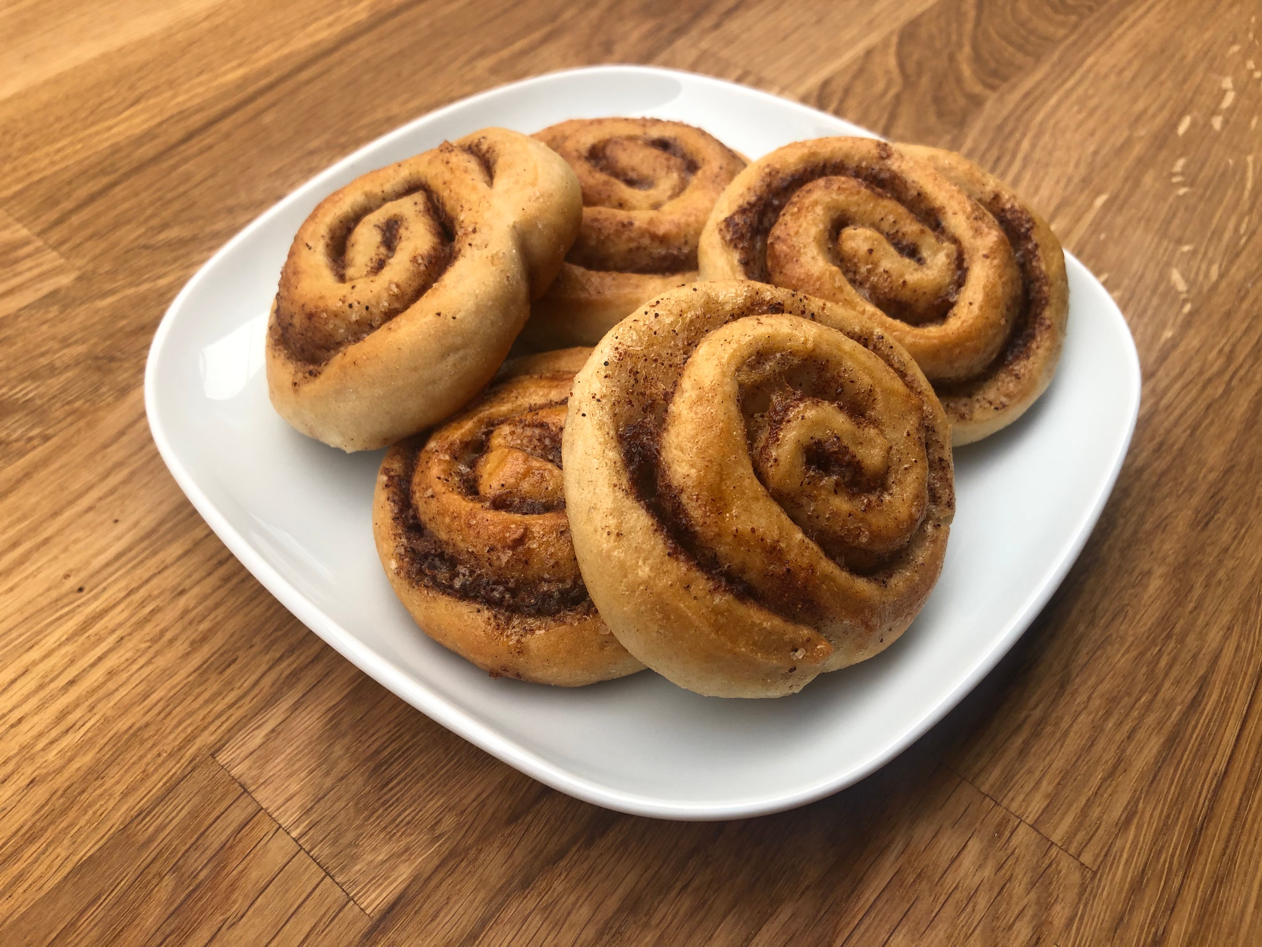 Až je těsto nakynuté, rozdělíme jej na dva díly. Každý vyválíme v obdélník, na který rozetřeme 50 g změklého másla a posypeme rovnoměrně polovinou cukru smíchaného se skořicí. Plát srolujeme a krájíme na kousky silné 2,5 cm. Ty klademe na plech vyložený pečícím papírem a necháme přikryté ještě 30 minut kynout.