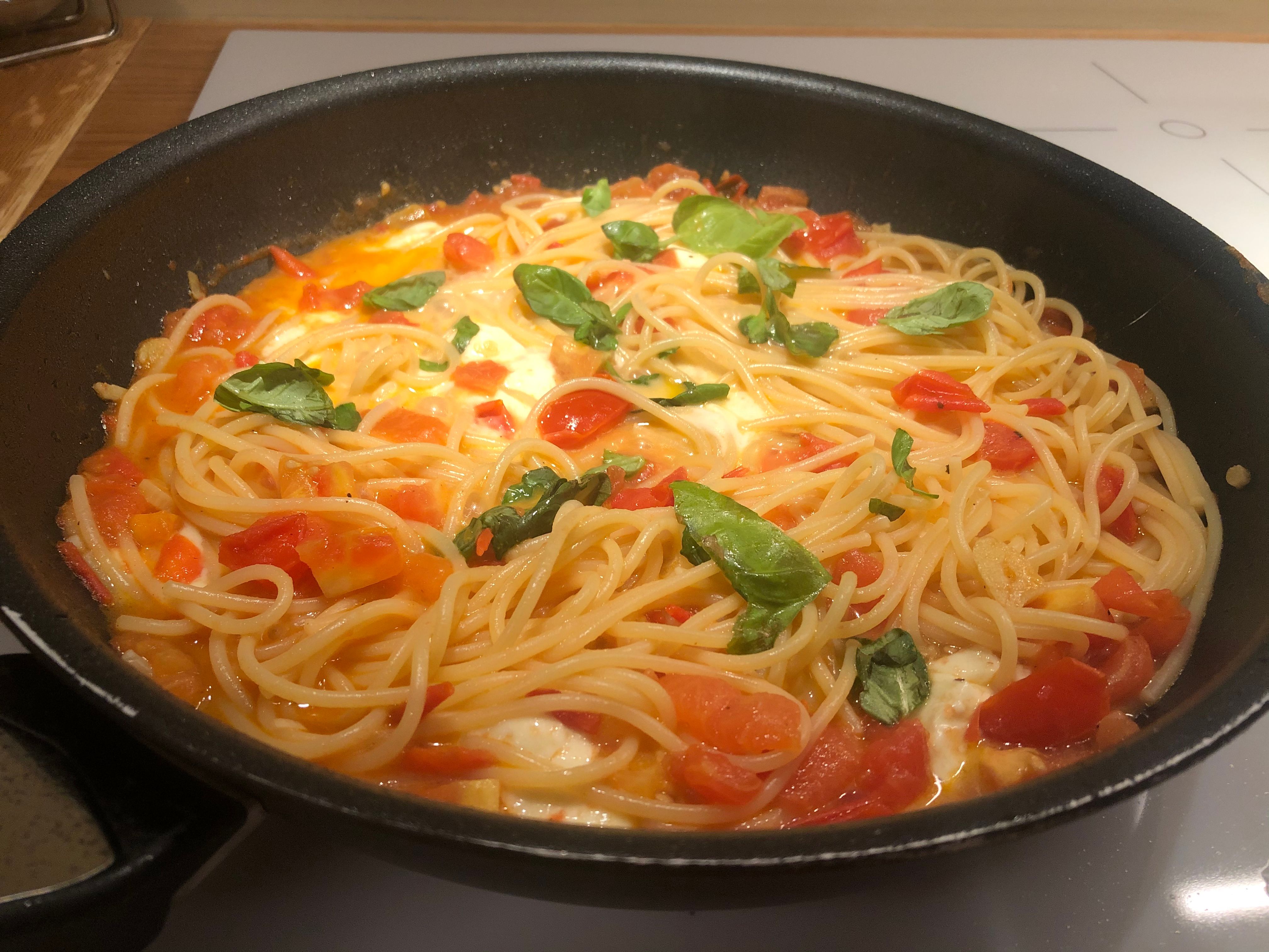 - V pánvi na oleji orestujeme česnek, přihodíme rajčata, zalijeme trochou vody, osolíme a opepříme. Jakmile rajčata získají lesklý vzhled, přihodíme špagety, dobře promícháme. Dochutíme natrhanými lístky bazalky.