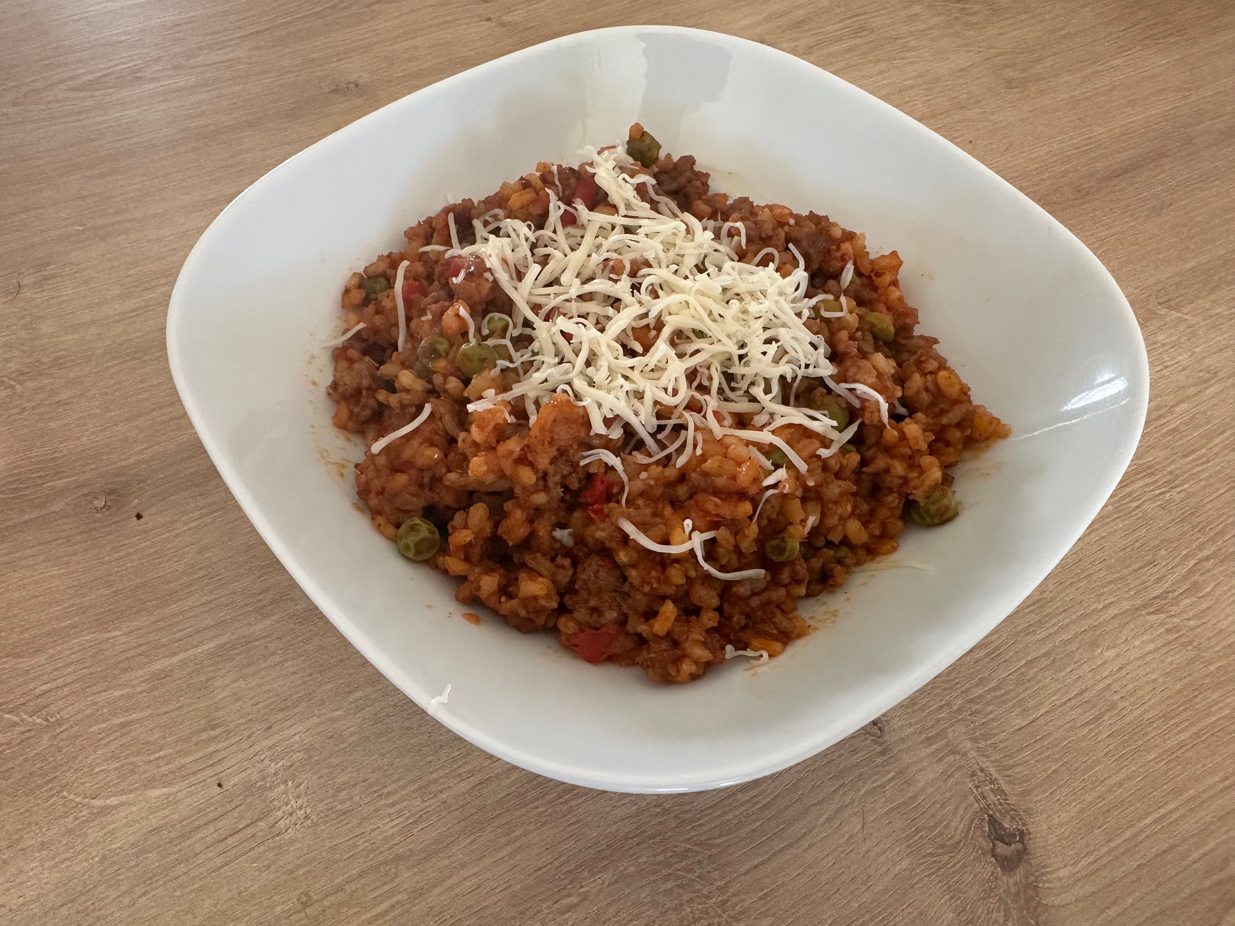 - Vaříme pod pokličkou na mírném ohni do změknutí rýže, v případě potřeby dolijeme vodu.